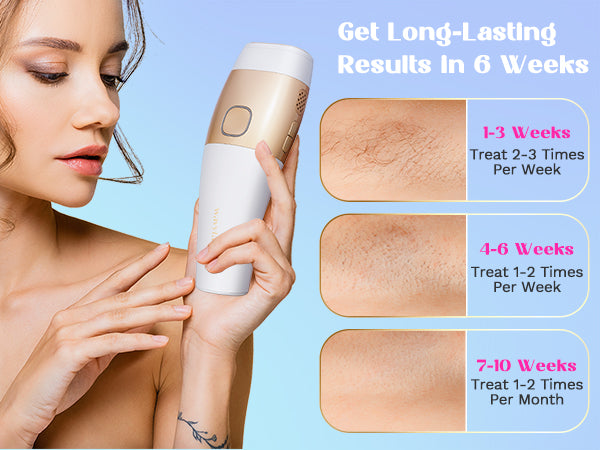 Laser hair removal brings noticeable results in just 4 weeks with 24J powerful energy, 600nm wavelength deeply penetrate hair follicle to break cycle of hair growth, remove hair efficiently and safely. It ensures long-lasting results